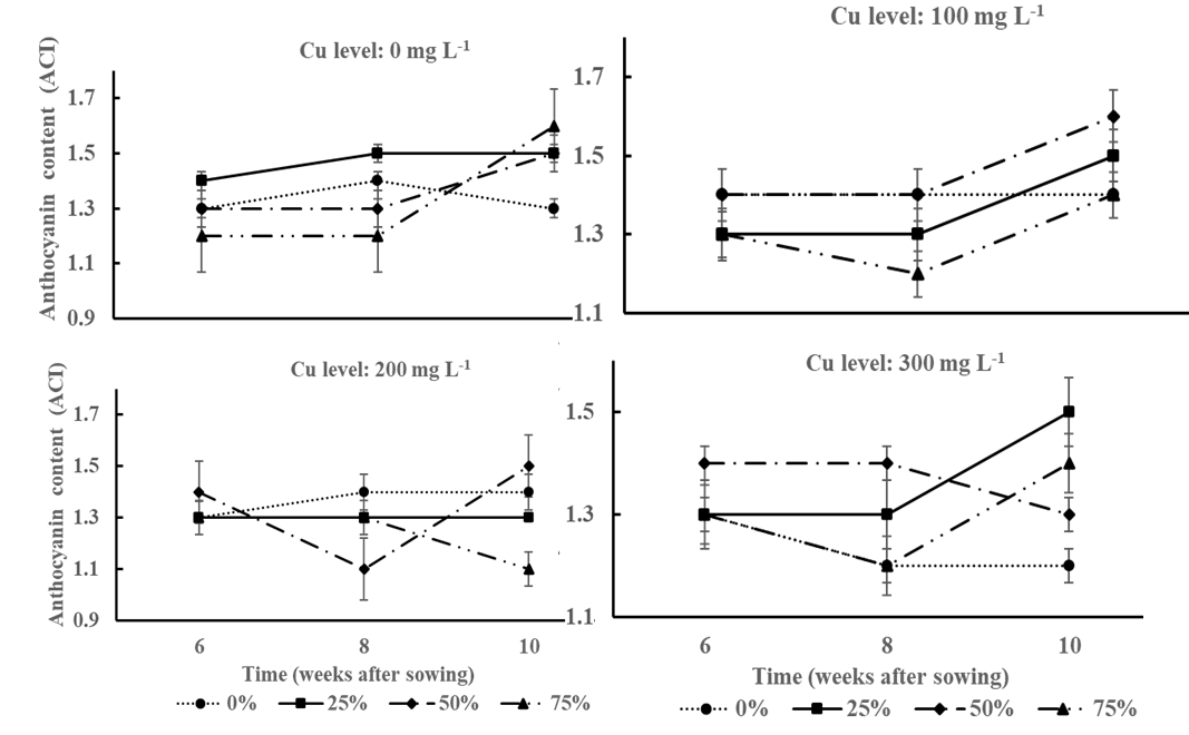 Figure 3 Effect of vermicompost and copper on carrot (Daucus carota cv.Nantes) leaf anthocyanin content measured between six and 10 weeks after sowing.