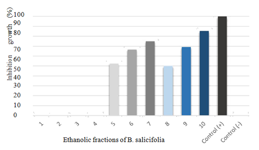The results of the biological activity of ethanolic extract fractions against S. aureus are reported in Figure 1, where it can be observed that the first four fractions (1, 2, 3, and 4) did not show inhibition activity on the microorganism at 24h. However, the following fractions (5 to 10) have antibacterial activity in the different percentages ranging from 52.5-85%. Fraction 10 showed the highest bioactivity of inhibition (85%) on the target organism, compared to the other fractions 5-9 and the control treatment (conventional chemical bactericide). This shows that the fractions with higher polarity present greater bactericidal activity, which indicates the presence of possible biologically active polar compounds of B. salicifolia against S. aureus microorganism. The results obtained are correlated with previous studies, which also demonstrate the antibacterial activity of B. salicifolia on Staphylococcus aureus.12 However, Carrizo et al.5 shows that oily extracts of B. salicifolia had activity on Staphylococcus aureus, Listeria monocytogenes and Bacillus cereus. This diverse activity in the extracts can be due to the diverse chemical compounds that have been found and analyzed in some species of the genus Baccharis like B. glutinosa, B. salicifolia and B. genistelloides, emphasizing the presence of flavonoids, terpenes and steroids, substances reductants, lactones and coumarins. The metabolites present in the genus Baccharis that have been attributed with various biological activities and properties are mainly flavonoids of the flavanone and flavone type; the kaurane nucleus diterpenes, cleorodans and labdano.13