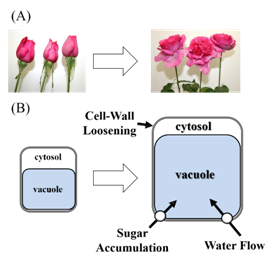 Figure 1 Flower opening and cell enlargement of rose petal cell. A: Rose-flower opening is a process of irreversible petal growth and reflection in which existing cells expand and fresh and dry weights increase; B: Sugar accumulation in vacuole, cell wall loosening, and subsequent water flow into cell are thought to be important for cell enlargement.