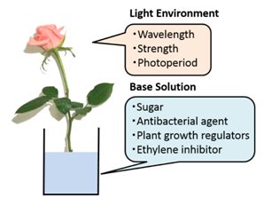 It has been shown that light environment control including photoperiod, light strength, and wavelength might become effective tools for controlling cut flower opening and improving its quality. Up to this day, a lot of studies have been conducted for the improvement of vase life and cut flower quality. Thanks to these efforts, several methods including ethylene production/action inhibitors were invented for these purposes. Light environmental control using LED light seems cost-effective and relatively easy to use. Thus, regulation of flower opening by light environment control is important theme to pursue for the further improvement of cut rose quality and vase life (Figure 2).