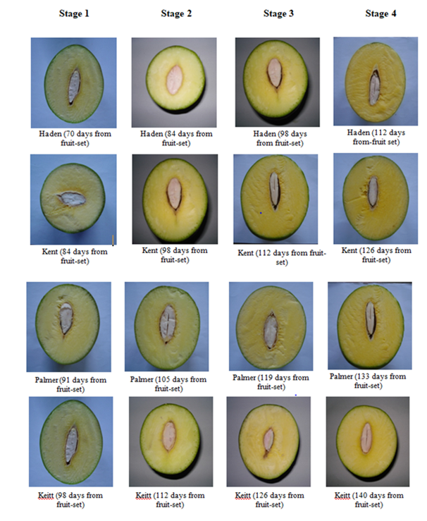 Haden, Kent, Palmer, and Keitt mango fruits showed distinct pale-yellow colouration on the flesh/pulp around the stone/seed at their physiological maturity stages for early harvest (harvest at 112, 126, 133 and 140 days after fruit-set, respectively) (Figure 1).