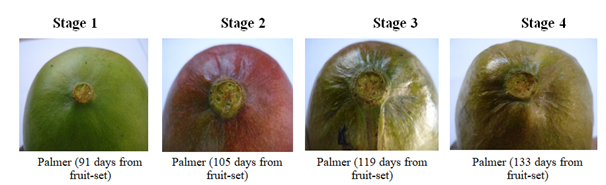 Ranges of appropriate harvest time for fruits of Haden, Kent, Palmer, and Keitt mango varieties at physiological maturity were determined and established to be 109-115, 123-129, 130-136, and 137-143 days from fruit-set, respectively, for early harvest; 116-122, 130-136, 137-143, and 144-150 days from fruit-set, respectively, for mid-harvest; and123-129, 137-143, 144-150, and 151-157 days from fruit-set, respectively, for late harvest.
