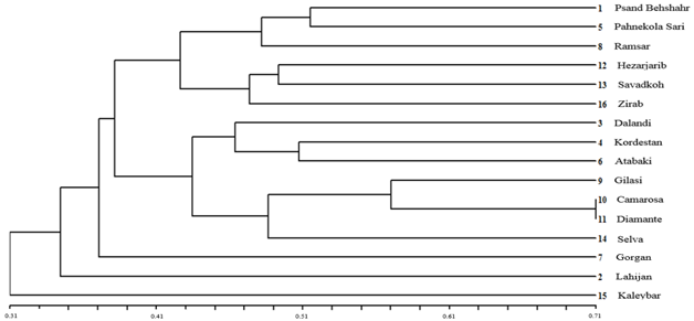 Figure 3 Constructed dendrogram based on Jaccard’s similarity coefficient and UPGMA algorithm to show the genetic relationships among 16 genotypes of Strawberry by ISSR marker.