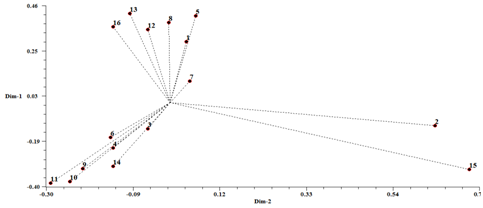 The diversity data obtained from similarity analysis were varied between 0.31 to 0.70 with an average of 0.43 The high genetic divergence found may have been due to a highly heterozygote genetic structure among the strawberry genotypes because of their different origins and ploidy levels. The highest similarity index was between Camarosa (10) and Diamant (11) cultivars with value of 70 %. These cultivars came from the same breeding programs and were developed at the University of California and may share ancestors. Morales et al.23 in studying of genetic diversity among strawberry cultivars using ISSR and RAPD markers, have reported high similarity index between Camarosa and Diamant cultivars with value of 67% similarity. The lowest similarity index was between pahnekola sari (5) and Kaleybar (15) accessions with value of 31% similarity. This degree of dissimilarity may be cause of a diverse genetic background of Kaleybar accession because of its geographical distance (Figure 3). In plant breeding programs the genotypes that have the highest genetic distance and high means of performance for the target traits are used as parents to crosses with adapted varieties for obtaining hybrids with greater heterotic effect and segregation.24–26 In this sense, it could be inferred that crosses involving the Kaleybar genotype because of its good characteristics such as high resistance to cold stress and lowest similarity (60%) to the other genotypes is the most interesting.