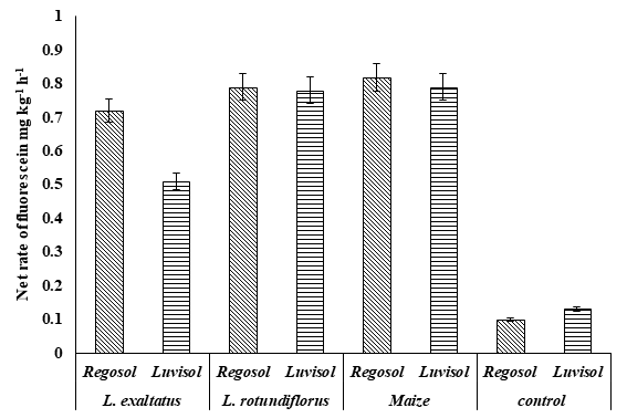 Since most soils in Jalisco, Mexico, are limited in organic matter, it was not surprising that the addition of labile organic residues (i.e., GM) to the soil increased FDA hydrolytic activity (a general indicator of microbial activity). Increases in microbial activity after soils were amended with GM and other organic waste (e.g., sewage sludge, fresh and composted animal manure) have been reported previously. For example Carvalho et al.10 in Brazil reported significant increases in FDA hydrolysis in soils amended with leguminous GMs such as Crotalaria, Mucuna, Canavalia, and Cajanus compared with the non-amended control.10 The values reported by these authors at 30 and 60 days of incubation in soil without organic amendment were 52.1 and 47.3 mg of released fluorescein FDA kg-1 respectively. However, in the soils treated with Crotalaria and Cajanus GM, the released fluorescein FDA values increased up to 50% with respect to the control treatment, while with Canavalia and Mucuna GMs the values were 100% greater. Similarly, in this study all soils amended with GM displayed significantly higher levels of FDA hydrolysis than the non-amended control. Overall, after of 14 days of incubation, on average the lowest levels of FDA hydrolysis were registered with L. exaltatus, while the highest levels were found in soils amended with GMs of L. rotundiflorus and maize, but no significant differences between them were observed.