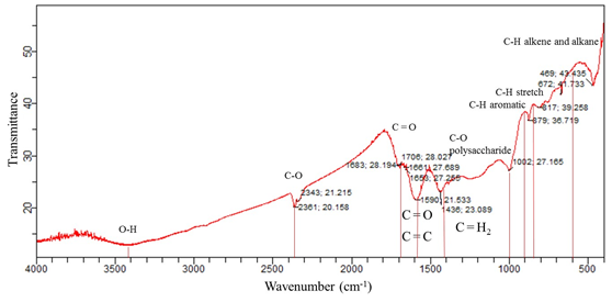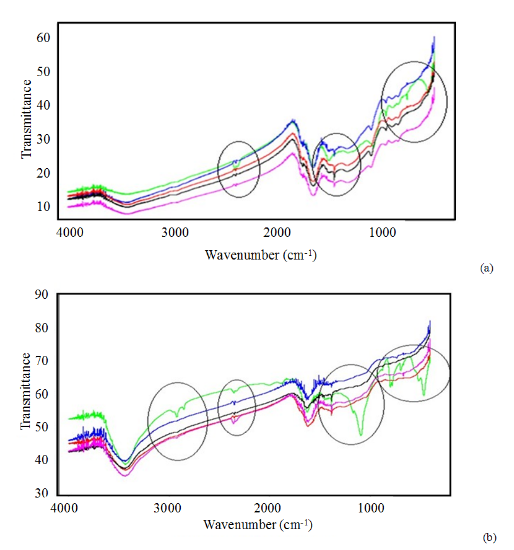 In comparison to Figure 1, which shows the analysis of initial biochar sample (without aging), it can be observed in Figure 4 that changes occurred in the band near 2300 cm-1, indicating that the functional group of C-O has disappeared from original biochar in relation to treatments. In the band near 1436 cm-1, there was a displacement of O-C-O or aromatic CH2. There was attenuation of bands under 100cm-1 of aromatic C-H, alkane C-H and alkenes with the disappearing of band in 670 cm-1.