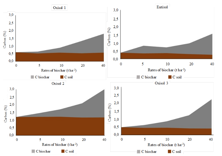 Figure 2 Representation of carbon content variation with origin discrimination (C soil; and C biochar) in four incubated soils during 120 days with rates of biochar.