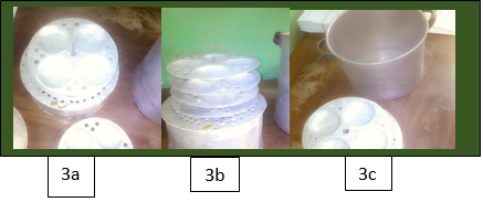 Description of idli steaming pot: The idli pot was modified and constructed in accordance with the standard idli pot, which consists of a chamber resembling a pot with a perforated cylindrical base and four moulds with cup-shaped depressions placed one on top of the other. Typically, the idli batter is put into the depressions that resemble cups, and they steam for 15 minutes. Figure 3 depicts the steaming pot for idlis. Figures 4-6 show images of the black gram, African yam bean, and pigeon pea, respectively. In Figure 7, matured black gram idlis were displayed.