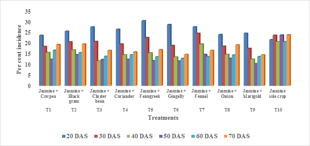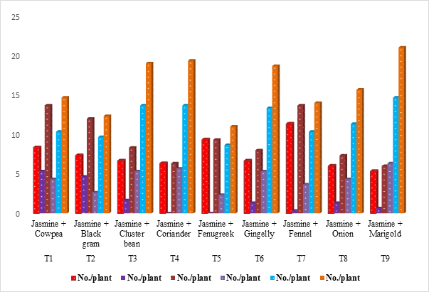 The highest population of pests was recorded in jasmine intercropped with fenugreek, blackgram and cowpea (11.33, 9.33 and 7.33 no’s/5 plants). The least population of pests in intercrops was observed in fenugreek and coriander (no pest) and highest in jasmine intercropped with cowpea and blackgram (5.33 and 4.66 no’s/5 plants) (Table 3).