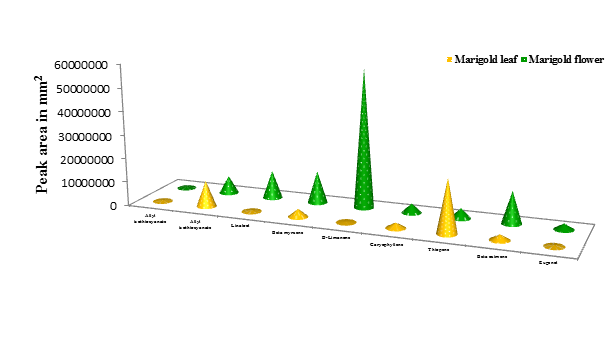 To identify the compounds responsible for the repellence of pests and attraction of natural enemies, the marigold flower and leaf extracts were analyzed in GC-MS. The chemical profile of marigold flower and leaf extracts contributed 43 and 33 compounds respectively. Allyl iso thiocyanate, linalool, caryophyllene, beta myrcene, tumerone, D-limanone and trans beta ocimene were the compounds of interest present, of which, linalool, beta farnesene, alpha farnesene, allyl isothiocyanate and caryophyllene were present in marigold leaves also.Chemically complex plant volatiles have multiple ecological roles in plant-insect interactions including attracting pollinators, acting as cues for foraging herbivores as well as functioning as direct defense, indirect defense, or interplant priming. Caryophyllene is an active component of marigold flowers and leaves and its potential in attracting two types of herbivore enemies viz., entomopathogenic nematodes and parasitic wasps in maize ecosystem was demonstrated by Kollner et al.32 The chemical fraction containing (E)-β-caryophyllene attracts egg parasitoid, Trissolcus basalis ♀s that parasitizes Nezara viridula eggs.33,34 Comparing the compounds present in marigold leaves and flowers, 9 compounds were present in common viz., allyl isothiocyanate, detected twice, linalool, beta myrcene, L-limanone, caryophyllene, thiopene, beta ocimene, eugenol, tetracosane, tricosane, pentacosane, heneicosane and bis (2 ethyl hexyl phthalate) with quantity in abundance in marigold flowers (Figure 4).35