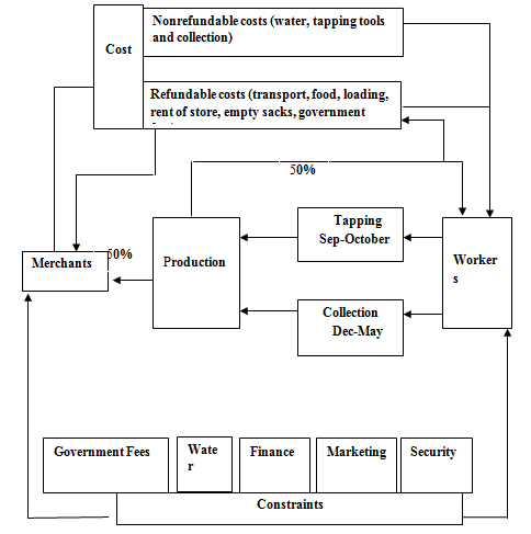 Frankincense is mainly collected by merchants. Merchants usually hire groups of labors; each group (locally called ‘tayeh’) consists of 5 members. Frankincense represents a main source of income for respondent in the study area. Collection of Frankincense was the main occupation for all workers and merchants. 90% of the workers plant other crops such as Sorghum bicolor and Sesamum indicum in the area during the rainfall season. Figure 1 shows the structure of production relationship between merchants and labors in frankincense production in Blue Nile State season 2011. The merchants provide production costs and workers’ needs such as transport, food, shelters, water, tools of tapping and collection, rent of store, cost of loading, payment of government fees and empty sacks. Tapping of frankincense usually begins in mid of September until end of October and collections start after 40- 45 days from tapping and continuo up to the end of the dry season, usually June and generally there are about 4-9 pickings per season depends on the weather conditions. At the end of the season the production is divided between workers and merchant equally, and then merchants deduct the cost of production from workers share except the cost of water, tools of both tapping and collection. This method of product sharing encourages workers to collect more Frankincense because they are poor and do not have the ability to work on their own.