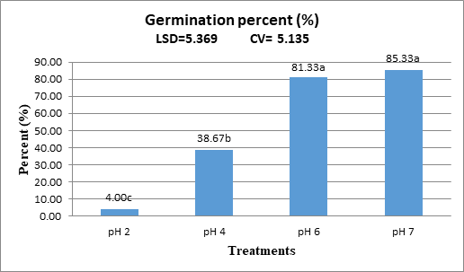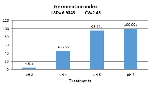 ANOVA showed highly significant different between treatments on seed germination index. The highest germination index (100) was recorded at pH 7 which was not significantly different with pH 6 (95.42). The lowest seed germination index was recorded at treatment pH 2 (4.61) (Figure 4).
