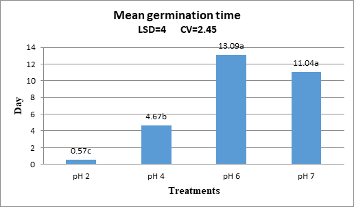 The analysis of variance (ANOVA) showed that all the recorded germination parameters (germination percent, mean germination time, germination speed and germination index) were highly significantly different (p<0.001) for different pH level. In the present study, increased level of acidity was found to adversely affect the germination of Swiss chard.