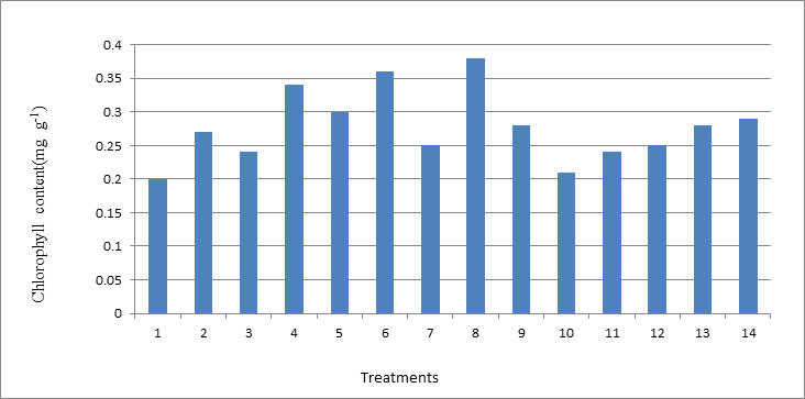 Forty five days old seedlings were transplanted in beds with a spacing of 60 cm x 30 cm. The common fertilizer dose of 50:25:125 kg NPK per ha was applied to all the treatments through Urea, SSP and MOP respectively. Bioregulators and FeSo4 were applied as foliar spray as per treatment schedule on 3rd, 6th and 9th month after planting and the biometric observation were recorded on 12 MAP. The total chlorophyll content was estimated in a fully expanded third leaf from the tip by adopting the procedure of Yoshida et al.7 and the xanthophyll and carotenoid contents of the flowers were estimated as per the procedure of Pathmanaban et al.8 and Lewis9 respectively.