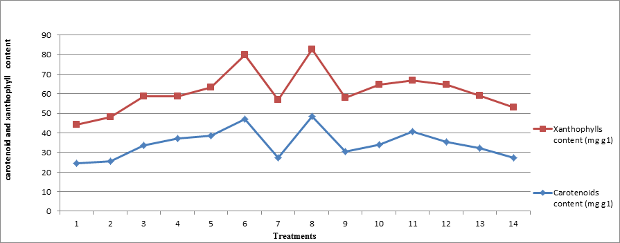 Figure 3 Effect of bioregulators and FeSo4 on carotenoid content (mgg-1) and xanthophyll content (mgg-1) of crossandra (Crossandra infundibulifomis L.)