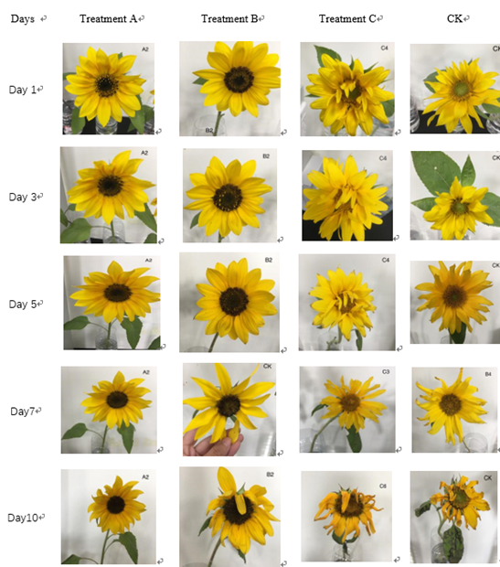 Preservative was added daily to keep 400ml per plastic bottle. The preservative loss of cut sunflower was measured every two day. It had been observed that the changes from first day to the end day when the ornamental value is lost. The leaf, petal, stem and stem base of sunflower were observed every two days and the relevant photos were taken. The effect of different preservative solutions had been evaluated based on prolonged vase days and ornamental value keeping ability.