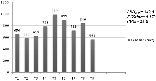 Highest mean value concerning leaves size of BLM was 989cm2 in the treatment T5 (½ NPK+ 2 ton/ha Poultry Manure) which is (76.29%) higher than the control. The minimum value was found to be 561 cm2 in control (T9).The higher value recorded in ½ NPK + 2 ton/ha PM could be attributed to a higher level of nutrient especially Nitrogen and Phosphorous available in PM for plant growth and their release as well as synchronization of nutrients released within the short growth period of BLM. Ghanbarian et al.11 reported that PM contains higher Nitrogen and Phosphorous as compared to other manure.