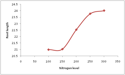 Nutrient levels had exerted very significant effect on length of root. Mean values in relation to different nitrogen levels indicated significant superiority of 300Kg/haN over other treatments. 300 Kg/ha N produced maximum root length of 24.012cm which is statistically at par with 250Kg/ha (23.769cm) and 200Kg/ha (22.537cm). 200Kg/ha N is also statistically at par with 100Kg/ha N and 150Kg/ha N. Minimum root length was produced by treatment 100Kg/ha i.e. 20.996cm. An increase in root length might be due to effect of environment, soil texture and on time and balanced manuring practices. Similar results were also explained by Nargave K10 that nitrogen level have significant influence on root length. These results are in accordance with Parrhasarathi et al.,11 and Pervez et al.4 There could be attributed to the positive influence of nitrogen on cell division, cell elongation, cell expansion synthesis, of amino acids, enzymes and chlorophyll which might increase the root length. The results are in agreement with the findings of Houchmuth12 who noted that the application of NPK fertilizer significantly increased the root length in radish (Figure 2).
