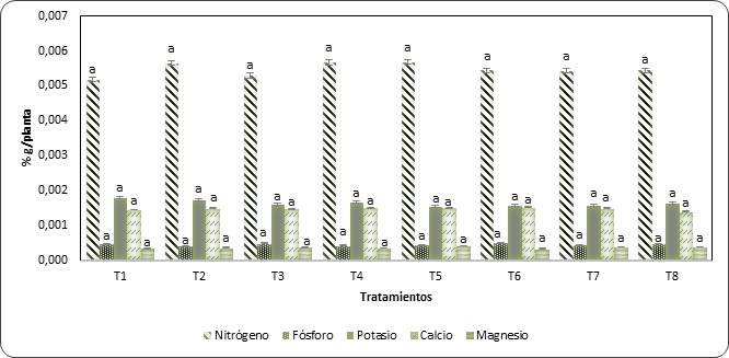 In Figure 1 the behavior is observed in the absorption of nutrients by the sweet potato crop 60 DDS. Tukey's test indicated no significant differences (p≥0.05) between treatments. However, there were increases in the average values of nutrients (nitrogen (N), phosphorus (P), potassium (K), magnesium (Mg) and calcium (Ca)) with the application of microorganisms as compared to the T1 controls and T2 (Figure 1).
