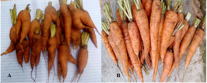 Carrots were considered ready when the root shoulder emerged from the soil. Harvesting was done at 70th day after seedling emergence. Harvesting was done by handling the leaves and pulling upward. After harvesting, grading was carried out to differentiate carrots with straight roots, from those with fork roots.