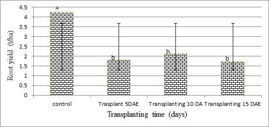 As concerns root yield, transplants presented significantly lower tonnage (t/ha) compared to the absolute control at P<0.05. Among the transplants, no significant differences were observed among the transplants at 10 and 15DAE (Figure 5). The highest root yield was 4.25t/ha, followed by transplants at 10 DAE with 2.14 t/ha, then 5DAE with 1.81t/ha and the lowest root yield of 1.73t/ha recorded in 15DAE. The low yields recorded in all transplants could be attributed to the fact that, transplanting means a complete change in the growth environment of the roots.15 Uprooting of seedlings from a direct seeded nursery traumatizes the plant and leads to some interruption of root growth and development once after transplanting. Therefore, the speed and quality of root recovery after transplanting are important factors that might have affected the root water uptake and assimilate partitioning in various sinks in transplanted carrot trials.