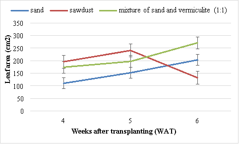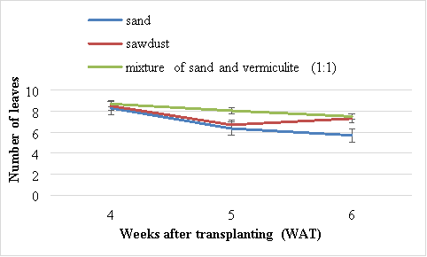 There were no significant (P>0.05) differences in the number of leaves of Swiss chard grown in different media. The highest number of leaves (8.7) was obtained in plants grown using the mixture of sand and vermiculite (1:1) (Figure 1). There was a rapid decrease in the number of leaves between 4 and 6 WAT. The lowest number of leaves (6.35), was obtained from plants grown using sand (Figure 1). The second best results were obtained from plants grown using sawdust.