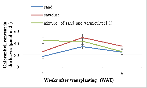 There were significant (P<0.05) differences in chlorophyll content of Swiss chard grown in sand, sawdust and mixture of vermiculite and sand. At 5 WAT, the highest chlorophyll content (48.9 µmolm2) was obtained from plants chard grown in sawdust (Figure 2). The lowest chlorophyll content (17.4 µmol m2) was obtained in the plants grown using sand and the second best results were obtained from those grown in mixture of sand and vermiculite (1:1). Generally the chlorophyll content decreased in all the treatments after 5 WAT.