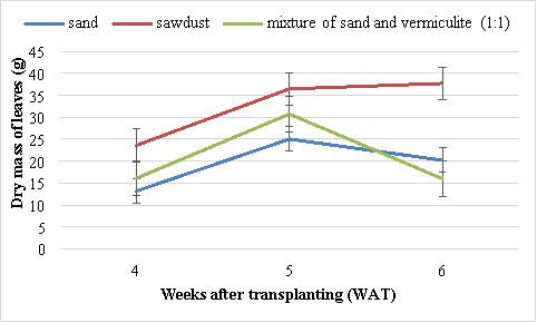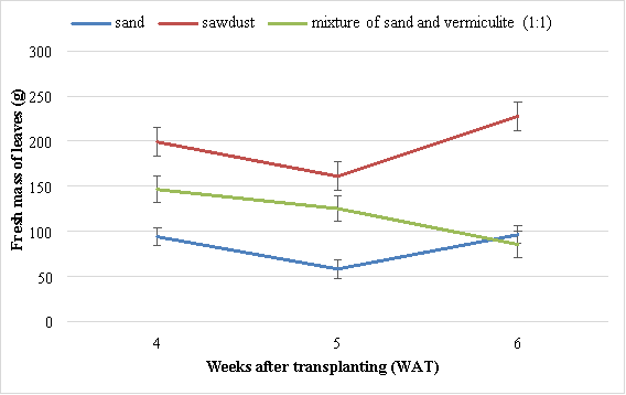 There were significant (P<0.05) differences in fresh mass of leaves of Swiss chard grown in different media. At 6 WAT, the highest fresh mass of leaves (227.7 g) was obtained in Swiss chards grown in the sawdust and the lowest mass (58.3 g) in Swiss chard grown using sand (Figure 4). The second best results were obtained from Swiss chard grown in mixture of sand and vermiculite (1:1).