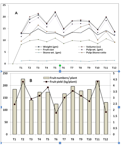 Data pertaining to fruit characters such as fruit weight (g), fruit volume (cc), fruit size (cm2), pulp weight (g), stone weight (g), pulp/stone ratio and total soluble solids (0B) are presented in Figure 1A. The results are described in different sub-heads of fruit characters as below.