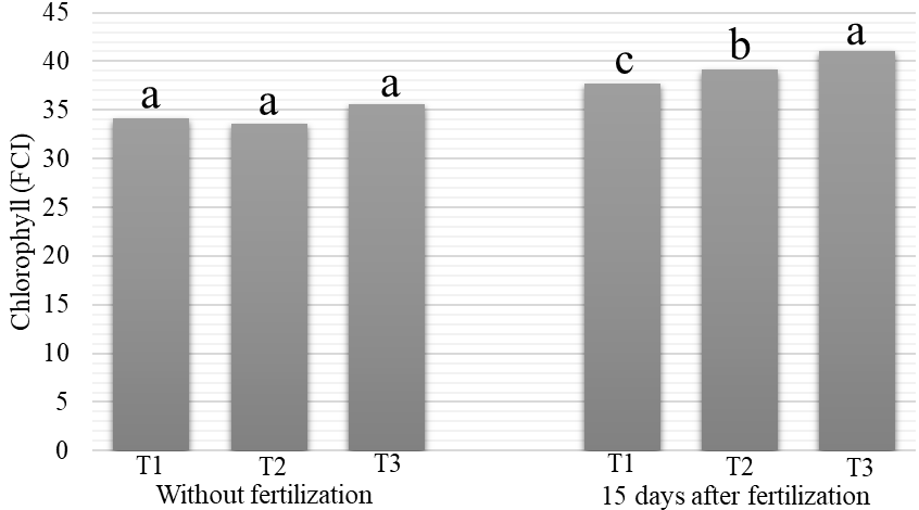 Figure 1 Foliar chlorophyll index (FCI) of Empire Turf® before and after 15 days of fertilization with (NPK+S 13-5-13+14). T1 - soil; T2 - soil + sand + soil conditioner (1v:1v:1v); T3 - soil + sand (1v:1v).
