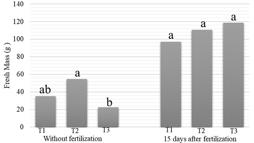 Figure 2 Empire Turf® fresh mass before and after 15 days of fertilization with (NPK+S 13-5-13+14). T1 - soil; T2- soil + sand + soil conditioner (1v:1v:1v); T3 - soil + sand (1v:1v).