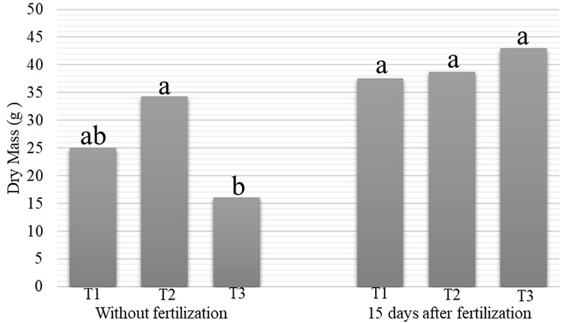 Figure 3 Empire Turf® dry mass before and after 15 days of fertilization with (NPK+S 13-5-13+14). T1 - soil; T2 - soil + sand + soil conditioner (1v:1v:1v); T3 - soil + sand (1v:1v).