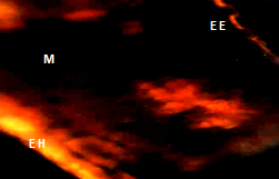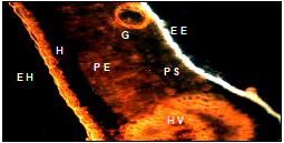 Figure 1 Anatomical section of an immature leaf shows fluorescence in the epidermis of the bundle (EH), underside (EE), gland (G) spongy parenchyma (PS), palisade (PE), hypodermis (H) and vascular bundle (HV).