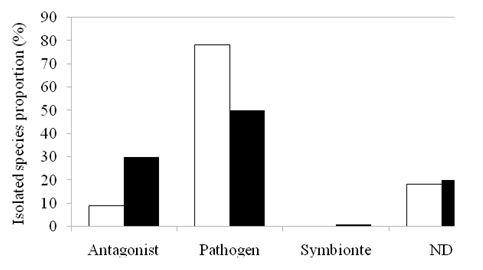 Classification was made according to the general habits of each isolated endophytic fungus (symbiont, antagonist or pathogen). Figure 1 indicates that the endophytic fungi more common associated, during two seasons,are those classified as pathogens. Antagonists are in second place and were more abundant in autumn than in winter. The only one symbioticfungy was isolated from orchid roots collected in autumn.