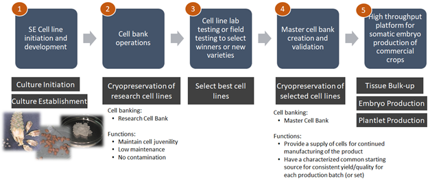 Creations of RCBs begin with the induction of embryogenic tissues from somatic explants. It is possible to generate many clones with different genotypes. Embryogenic tissues of each clone are cryo-preserved in about 5 -10 cryovials to create multiple RCBs. Meanwhile, cells of each RCB are cultured in the lab to produce SE seedlings, then planted in the field for testing. Years later, the clones with the best performance are selected and come to the market as a new cultivar or variety.