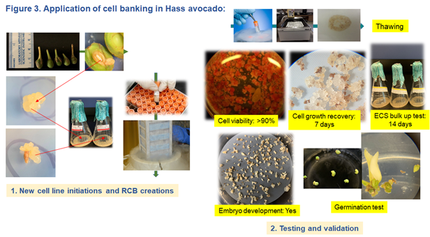 Cell banking technology has first implemented insomatic embryo production process in pine species (Figure 2). In the last several years, the technology has also been successfully applied to other economical important crops such as avocado (Figure 3), sugarcane, banana and etc. Nowadays at ArborGen, all pine varietal seedlings come from validated MCBs. Millions of SE seedlings are produced each year and sold in US, Brazil, New Zealand and Australia. Meanwhile, continuous efforts are made each year to develop new cell lines, RCBs, field testing and then new varieties.