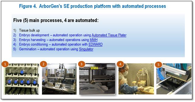 Creations of master cell banks secured the supplies of starting cell materials. Then automation and mechanization are key components for scale up. Throughout the pine SE production platform at ArborGen, 4 out of 5 main processes are automated (Figure 4). All machines for the automation are proprietary knowledge of ArborGen and were designed by ArborGen scientists.3