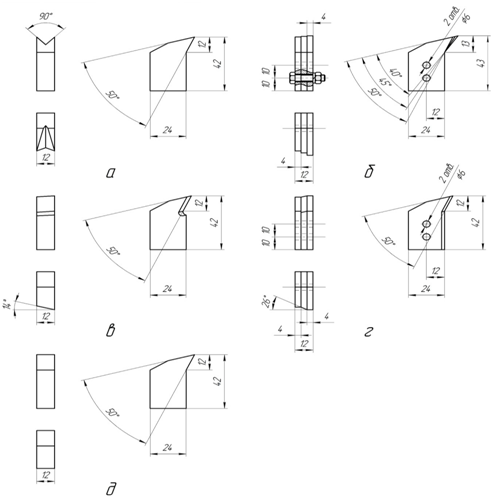 To conduct the study design was developed experimental setup (Figure 1), which allows simulating the process of grinding milling timber. The installation includes a power and measurement modules as well as the mechanism supplying structurally formed in one frame. The power module consists of a circular shaft mounted on the bearing mediated rah. On the shaft with keyed connections fixed disk whose parameters are selected depending on the cutting conditions. In this experiment used a 132mm disk diameter and 12mm in width. According to the thus formed conductive disk has two symmetrically arranged groove, in which establishes a knife. The diameter of the disk set of knives is 156mm. To exclude a Departure knives and their rigid fixing in grooves provided on the clamp back portion of the knife. All the knives are different of one another geometric shapes of cutting edge and the rake face, ime-dissolved width of 12mm and a protrusion on the disc surface of 12mm (Figure 2). Measuring installation module (Figure 1) can adjust the torque depending on the cutting forces arising on the cutting edge of the knife. As the torque sensor applied dynamometer device-parameter. The feed mechanism of the "slide" is moved along the guide pillars perpendicular to the axis of rotation of the cutting instrumen- ta. On the slide there are a pressing device and aligning plates between which the workpiece is clamped. Feed by rotating mahovich- ka mounted on the spindle, which nut is secured on the frame, the screw is itself connected to the carriage. installation drive provides static or dynamic. Studies were conducted under the following conditions: static cutting skoe; cutting circle diameter d=156mm; Cutting width 12mm; Rear angle a=15°; cutting angles d=65° (knife № 1, 3‒5) and d=55, 60, 65°(knife № 2); sharp knives; Knife material - ressorno- alloy spring steel 60S2G (GOST 14959-79); infeed knife Sz=1... 12mm; po- kind of wood - Pine (density r12 = 0,40g/cm3); wood humidity W = 18%. № knife 1 has a cutting edge radius shape and rectilinear hydrochloric front surface. Knife № 2 differs stepwise cutting edge and the stepped front surface (three steps). Angle PE zaniya first stage d=55°, second - 60°, third - 65°. № knife 3 has a single-nostoronny cutting edge inclination (angle oblique sharpening w=14°) and single- sided front slope surface. For knife № 4, as for the blade № 2, characterized by a three-step shape of the cutting edge and the rake face, but the cutting angle for all three stages of the same d=65°, the second stage has a slope-sided front surface (oblique angle za- point w=26°), being a smooth transition between the the first and third stupenya- mi. Knife № 5 has a straight cutting edge and a straight front surface. Classification of forms of blades adopted in accordance with.2,4,6,12,13 Cutting was performed by applying torque to the operating shaft. When this torque is measured depending on the feed to the knife.