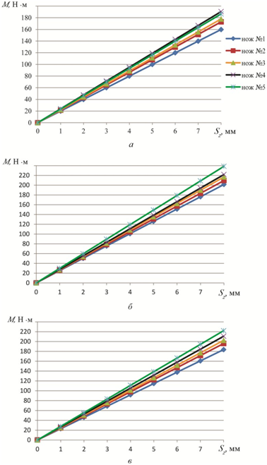 When cutting along the grain of wood chips were obtained in a curved shape in cutting the wood across the grain at small feeds - short and brittle chips, consisting of separate elements loosely connected to each other at high feed - element chip, but more strongly associated between svya- a. Sometimes, during the chip cutting large thickness in the lateral direction occurred splitting the work piece along volokon. When cutting wood butt obtained partially scattered chips. When cutting wood knife (№ 5) with a rectilinear cutting edge and the rectilinear front surface able to cut chips: along fibers - at supply Sz=12mm in the end - when Sz=8mm, transverse fibers - when Sz=7mm. In rare cases, able to cut chips of greater thickness, as when applying the above values occurred blade jamming in the wood. When cutting knife № timber 5 at small feeds thickness arr a- chip being operated commensurate with the feed quantity. When cutting along the grain dreve- Sina when Sz=12mm chips formed middle of the thickness - 9mm (valid for all blades). This is because the loan sre-chips deformed front edge of the knife and squeezing between the body of the cutting tool and the workpiece. When cutting the rods stru-large thickness (at Sz=12mm) fibers along different knives their amount was approximately the same. The experimental data have established the connection between the torque M and serving knife Sz and construct graphs of this dependence for the three main cases of cut (Figure 3).