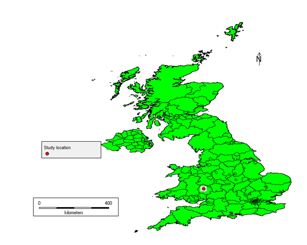 This study was conducted at Flag Station Farm at 8:30 am on the 17th of November2017.Flag station farm is located in Yazor, Herefordshire. Post code HR4 7HN.A GIS map was created in DIVA GIS to illustrate the study area (Figure 3).