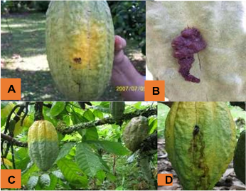 Figure 12 Symptoms of Cocoa pod borer. A, small freckle. B, fecal matter on the perforations. C, premature yellowing of the fruit. D, suppurations across the perforations made by the larvae for the emergence of the adults.