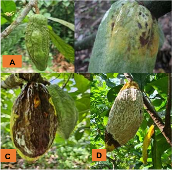 Figure 2 A, Young fruit (cherelle) with bellies or humps. B, fruit more ager with oily spots under the epidermis. C, fruit with brown spot. D, fruit in sporulation stage.
