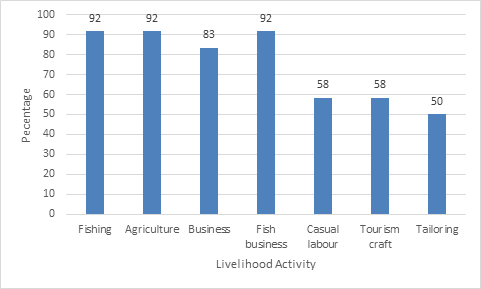 About 92% of respondents depending on fishing, agriculture and fish business as the main livelihood activities. They often involve household fishing or farming income, supplemented with other activities. Generally, fish catches and products are sold at dispersed points of landing and partly being consumed at a family level.9 The small scale fisheries or artisanal fishery is characterized by simple technologies such as fishing traps, dhows (mashua), outrigger canoes (ngalawa) and small wooden boats, low level of productivity which is constrained by social and geographical features.9 Fishing takes place in shallow water where fish forks employ a wider range of harvesting methods and techniques.9