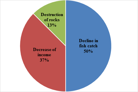 About 50% of respondent perceived the decline of fish catch as the main impact of change in environment and coastal resource management. This followed by the decrease of income (37%) and destruction of rocks (13%). Decline in fish catch and income were frequently mentioned by the small scale fisheries as it constitutes their livelihood while the environmental aspect less weight. Other environmental impacts include eroded beaches, destructed fish haunts and loss of coastal infrastructure caused by environmental changes and poor policy enforcement. The policy implementation, even when the policy set and Government forces are equipped for it, implementation becomes negligible.