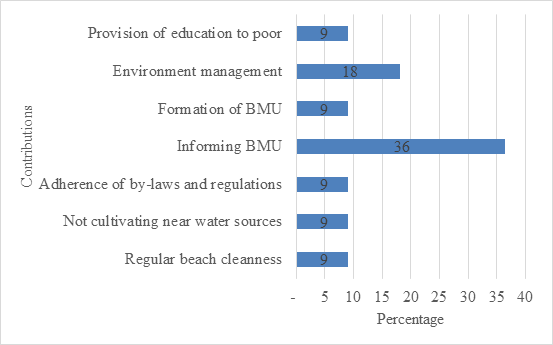 The contribution of local communities in coastal resource management as indicated in Figure 5 include informing the BMU and participating in environment management. Other contributions are provision of education to others/poor, formulation of BMU, adhering to the bylaws and regulations and regular beach cleanness. Such contributions are of importance in coastal resource management and improving local livelihood along the coastal areas.