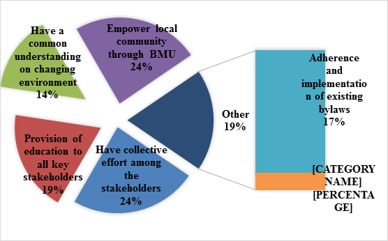 Awareness raising, communities sensitizing and providing technical information on fisheries resources ownership and management and provision of education to all key stakeholders comprise a hinge role in resource management. This need to include the adherence and implementation of existing bylaws, provision of incentives to the local community for managing resources. Figure 7 describes the perceived measures used to reduce the adverse impacts.