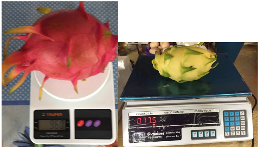 In general, the bibliography indicates that in the first year we can obtain one or no pitahaya, from 4-5 crops per season that normally take from one month to 45 days; however, this project came to obtain a total of 300 kg obtained in an area of 617 m2 the first year, with a total of 8 crops obtained every 19 days, which surpasses the reports by Rodríguez.6 This production consisted of 179.4 kilograms of Selenicereus undatus and 119.6 kilograms of Selenicereus megalanthus, respectively. The highest recorded weight of Selenicereus undatus was 960 grams while the highest recorded weight of Selenicereus megalanthus was 775 grams, compared to the normal weight of pitahay as in Southeast Mexico which are typically between 350-450 grams.