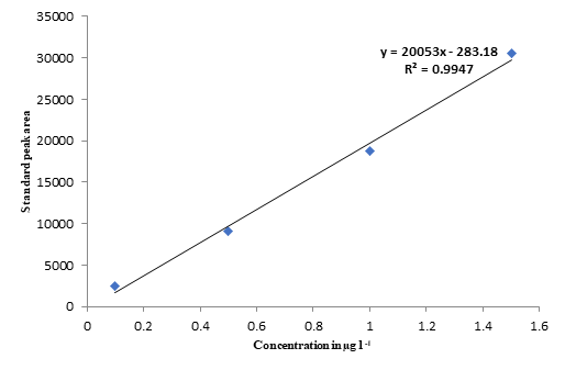 The residual analysis methodology was validated with standardsofcarbosulfan with known purity using Gas Chromatography. Recovery studies were carried out to test the validity of the current methodology and the results were furnished in Table 1. The linearity of the calibration curve was established in the range of 0.1 to 1.5µg g–1(4 levels) with a correlation coefficient of (R2) 0.994 in brinjal leaves (Figure 2). The standard chromatograms of carbosulfan at different levels of spiking were illustrated in Figure 3. The recovery percentage of the brinjal leaves ranged from 78.36 to 84.87 per cent, with the average recovery of 81.36, 83.01, 83.02 and 79.96 percent at the fortification level of 0.1, 0.5, 1 and 1.5 mg g-1. The recovery of carbosulfan on brinjal leaves was more than 80 percent indicating the reliability of the analytical method followed.The minimum sensitivity or detectable level of Gas chromatography was 0.1ng for carbosulfan. The lower quantitative limits of GC for brinjal leaves considering 10g weight were 0.01mg with the final volume of the extract being 2ml and injection volume of 2ml. The residual values below 0.01mg is considered as below detectable Level (BDL).