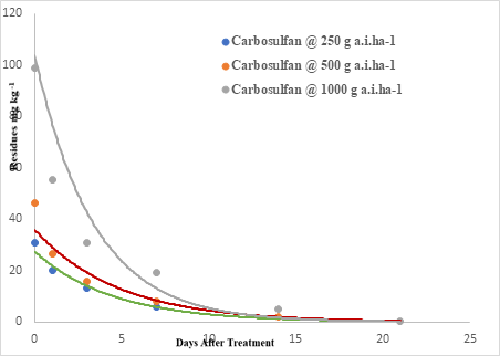 The primary deposit of 46.24µg g–1 at 1 hour after spraying dissipated to 46.34, 26.58, 15.85, 8.05 and 2.071 µg g–1with a dissipation percentage of 42.64, 65.79, 82.60 and 95.50 at 1,3,7 and 14th DAT and reached below detectable level on 21st day at double the recommended dose of 500 g a.i.ha-1. The largest dose of carbosulfanie. 1000 g a.i.ha-1 recorded an initial deposit of 99.07µg g–1, which dissipated to 55.2,31.02, 19.4, 5.09 and 0.009 mg kg-1 with a dissipation per centage of 45.87, 68.05, 80.40, 95.49 and 99.07 per cent and reached below detectable limit on 28th DAT recording 100 per cent dissipation (Figure 4).