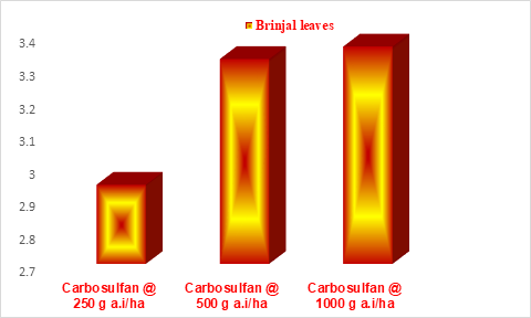 The carbosulfan residues extracted ib brinjal leaves immediately after application was 30.92, 46.34 and 99.07mg g-1 respectively for 250, 500 and 1000 g a.i.ha-1. It was quite expected that higher levels of application resulted in higher amounts of initial deposits on brinjal leaves. The quantity of carbosulfan after the expiry of 14 days was BDL, 2.071 and 5.09 mg g-1 for the three doses of carbosulfan. The current findingswere in line with previous findings that carbosulfan residues were detected till 7 DAS and they were above MRL till 3 DAS with earlier reports that carbosulfan residues in brinjal plant was detected till 7 DAS.17